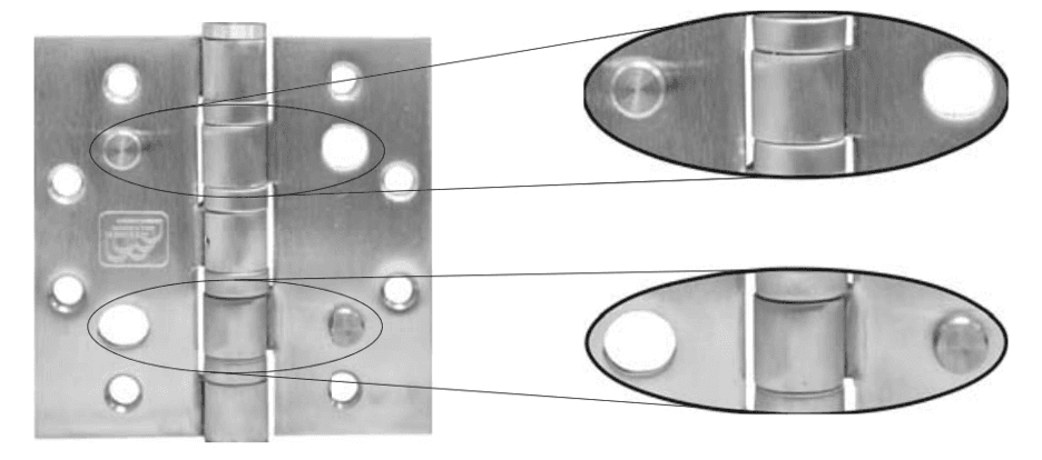 Maximum security offered to prevent slipping of leaves as stud on one leaf projects into hole in opposite leaf when hinge is in closed position. Full mortise hinges only Non-Removable pin feature included. This feature is intended as a deterrent only.